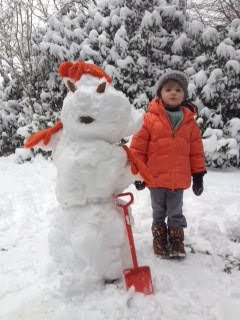Our Christmas wish came true. It snowed last night so Phin and mini got up early and put on their JCrew and Bonpoint skiwear to build their cool snowman