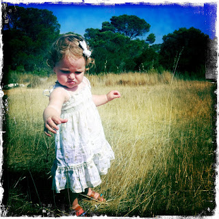 Mini took a stroll round our land this morning. Checking out the wheat field in her new Sunuva gold paisley print sundress with charming little indian bells on the ties. Thank you Emily for introducing me to your fab beachwear for kids. Sun-protective and stylish! And covering her little feet were mini's hand made leather and turquoise bead sandals that I'd bought last year on Mykonos when she was three months old. I couldn't even imagine how she would fit them let alone be able to walk.